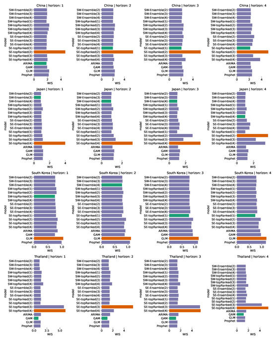 WIS metrics for predictions across China, Japan, South Korea, and Thailand and four prediction horizons (1, 2, 3, and 4 weeks forward). The metric is on a logarithmic scale with a base of 10. Furthermore, all values were multiplied by 10, so no value would not go below 0. Teal bars are the best metric for the particular combination of location and horizon, and dark orange bars are the models with the worst metrics. SW stands for Sub-epidemic Wave and SE for n-Sub-epidemic frameworks. Ranked models are singular models used for the ensembles.