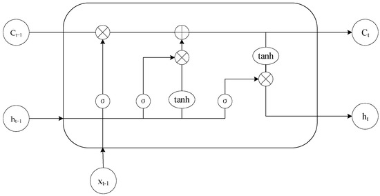 The hidden layer cell structure of LSTM is shown in Figure 1. By introducing gating mechanisms, it addresses the issues of gradient vanishing and exploding in RNNs, making the depth of the neural network unfolded over time easier to train. Its forward computation process is illustrated by Equations (9)–(13):
