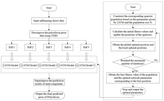 This paper is organized as follows: The second part constructs three single algorithm models of the VMD algorithm, Sparrow Search Algorithm, and LSTM model. The third part further constructs the combined VMD–SSA–LSTM model and accounts for the selection of indicators, data sources, and metrics for evaluating the prediction results of the model in this paper. The fourth part inputs the collected data into the VMD–SSA–LSTM combined model, analyzes the prediction of Chinese polysilicon prices, and compares the prediction accuracy and error of different models. Finally, we obtain the conclusion of this paper.
