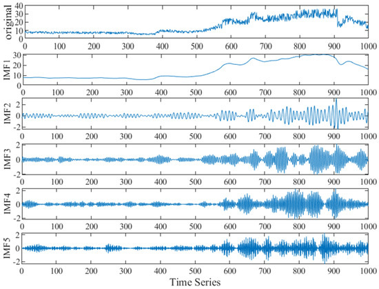 In this study, the polysilicon price data are decomposed into five IMF components using VMD, with the decomposition results shown in Figure 3. The figure captures the IMF components of the price data from the 1st to the 1000th trading day, where the first row represents the original sequence signal, and rows 2 to 6 represent the VMD-decomposed IMF components (IMF1 to IMF5) from low frequency to high frequency. As observed in Figure 3, decomposing the polysilicon price data into five IMF components results in five relatively stable price subsequences.