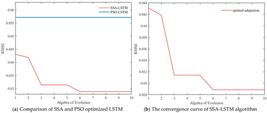 To enhance the model’s expressive capability, activation functions are used to introduce nonlinear factors. The combination model consists of an input layer, LSTM layer, ReLU activation layer, and output layer. For the LSTM model, the selection of parameters is a key factor in determining the prediction effect of the model. In order to establish a more accurate prediction model, it is necessary to select an appropriate optimization algorithm to improve the prediction accuracy. Therefore, the SSA and Particle Swarm Optimization (PSO) are used to optimize and compare the three network parameters. The fitness and iteration times of the algorithm are shown in the following figure. It can be seen from Figure 4a that the fitness of PSO–LSTM is 0.058, while the fitness of SSA–LSTM is 0.029. To reduce the influence of subjective experience on the combination model, the SSA is employed to optimize three parameters: the number of neurons in the hidden layer, the number of iterations, and the learning rate. The LSTM network step size is set to 5, and upper and lower boundaries are established.