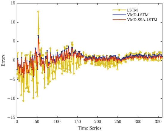 It can be observed that when predicting the 366 polysilicon price data in the testing set, the single LSTM network exhibits prediction errors fluctuating between [−10, 15] for the complex nonlinear polysilicon prices. In contrast, the VMD–SSA–LSTM model demonstrates smaller prediction errors and improved stability.