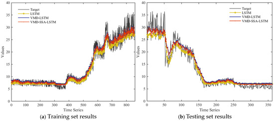 From Table 4, it can be seen that the VMD–SSA–LSTM combination model performs the best in the training set. Specifically, the performance metrics show that this method reduces the MAE by 0.9442, the RMSE by 1.3209, and the MAPE by 7.1617 percentage points, and increases the R² by 0.0547 compared to the single LSTM network. This indicates that the model’s prediction accuracy is superior after VMD compared to predictions made without data decomposition. Additionally, compared to the VMD–LSTM prediction method, the MAE is reduced by 0.1221, the RMSE by 0.1239, the MAPE by 0.5573 percentage points, and the R² is increased by 0.0033. Therefore, the proposed combination model also performs the best in the testing set. This further demonstrates that in the complex prediction of polysilicon prices, the constructed combination model has significant advantages and can effectively enhance the accuracy of polysilicon price predictions.