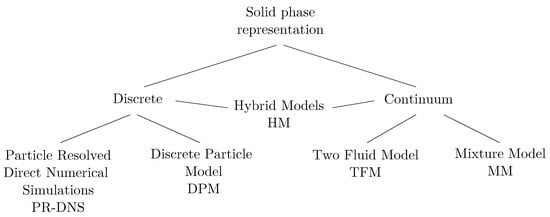Additionally, hybrid models integrate features from both continuum and discrete models by adaptively applying continuum and discrete approaches depending on local conditions, thus achieving a balance between computational efficiency and model fidelity. This category includes the multiphase particle-in-cell (MP-PIC) method. See Figure 1 for an outline of model classifications.