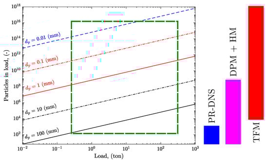 Number of particles with density of 2600 kg/ per load and per size. The inserted green rectangle provides an estimation of particles and loadings encountered in industrial applications. Colored areas on the right represent approximate ranges covered by the PR-DNS, DPM + HM, and TFM modeling approaches. Adapted from [1].