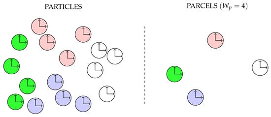 In the MP-PIC methodology, the fluid phase is considered as a continuum using an Eulerian reference frame, while the solid phase is modeled as both a discrete and a continuum phase, represented in a Lagrangian reference. Furthermore, when particles are of equal physical properties (e.g., diameter, density), they can be grouped together as parcels; see Figure 3, where four particles are represented by a single parcel (statistical weight of the parcel is ). This concept allows for reducing the size of the problem, making it possible to perform simulations at an industrial scale, where the trend is more important than the accuracy of the solution [2].