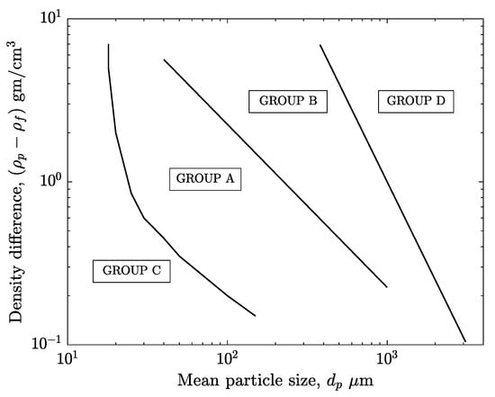 In 2012, Karimipour and Pugsley [31] applied the MP-PIC model to a BFB for Geldart type A particles using the Barracuda VR® software; Figure 4 shows the Geldart classification of the behavior of gas–solid fluidization. In this study, they tested three different mesh sizes and two drag models. Notably, the solid stress model used was the one introduced by Lun in [32], presented in Equation (9).