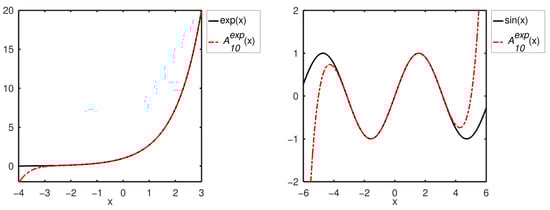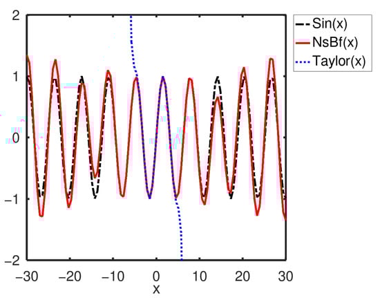 The NsBf are seen more rarely, they play a role when studying Bessel’s differential equation or some similar equations, such as presented in [,]. The numerical test (Figure 1) also suggests the NsBf significantly over-perform the Taylor series when periodic functions are approximated.
