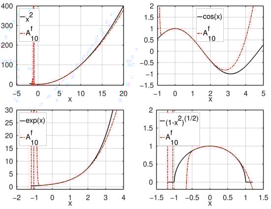 - It is difficult to assert about the convergence . The cases (c) and (e) suggest that (for some functions) a higher approximation order does not improve the convergence. Increasing N, however, extends the range and thus enlarges the interval on which provides some (at least rough) approximation of f.