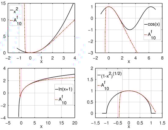 where the point of the differentiation needs to be specified. In the four examples which follow, it is natural to build the approximation around . For a different point , a shifted version of the approximation is used so that the argument becomes zero for . Thus, for simplicity and without loss of generality, we choose the four examples ; for any other value, the expansion can be shifted by shifting the argument.