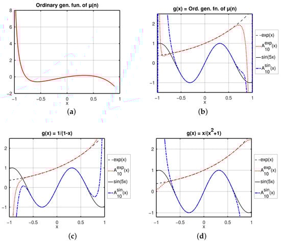 We conjecture that the delta functions cannot be constructed and prove it for stronger assumptions hereunder. The construction of the approximation from the characteristic numbers (i.e., the raw moments) is a well-known moment problem []. The approach we present is, however, more general (than the classical moment problem) since, in the latter, one usually assumes f to be positive (often interpreted as a measure, a probability function, or a mass distribution), which we do not do here. Depending on the interval, the moment problem is labeled as Hamburger (), Stieltjes (), or Hausdorff (both a and b are finite). For illustration purposes, we choose the latter and (without loss of generality, a complete system of orthogonal functions on can be scaled to arbitrary interval by linearly scaling the argument of the functions) assume , (and a general, possibly negative f). In this context, we prove