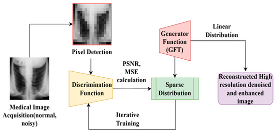 Equation (5) expands upon the pixel-level error detection by considering the normalized fluctuation range of pixel intensities, represented by F, relative to the minimum and maximum intensities observed in the noisy image, where are the current noise-contaminated version of the image and its corresponding raw input. The conditions and represent the maximum possible fluctuation and error pixel and the minimum possible fluctuation and error pixel observed from the input images. The variables , and are used to represent the velocity, frequency, and discolouration observed in both the raw and noise images. This observation is used to compare the images for suppressing the noise present in the images. The pixel distribution process is illustrated in Figure 2. The main goal of the proposed GAN-aided Low-Noise Discriminator (LND) approach is to learn and reduce noise patterns that are shared across several imaging modalities, making it technology agnostic. These modalities include CT, MRI, and X-rays. The model was trained to generalize across varied acquisition settings by exposing it to a wide dataset that included images from several imaging modalities with differing noise characteristics. The level of artefacts or noise elements that are distinctive to a certain modality may cause it to function differently. Examining the possibility of combining modality-focused pretraining with domain-specific fine-tuning might increase generalizability.