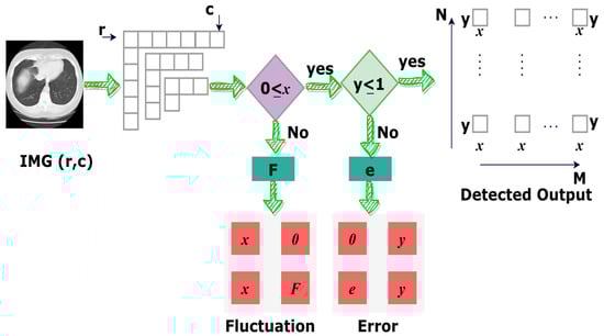 Equation (4) shows PSNR is derived from its definition as a logarithmic measure of the ratio between the maximum possible power of a signal (the image’s maximum fluctuation) and the power of the noise (MSE). In Equation (4), the variables and represent the input medical image’s maximum fluctuation (variation) and pixel error. Using these features, the process of detecting the pixels is performed as follows: