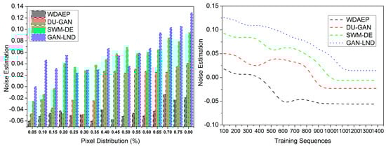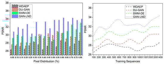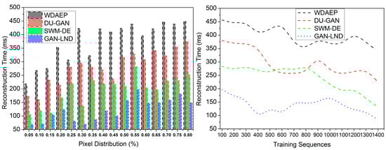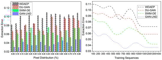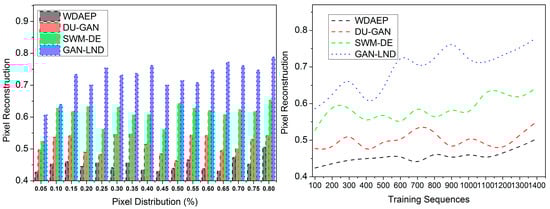 Apart from the above experimental analysis, the following metrics, pixel reconstruction, PSNR, noise estimation, reconstruction time, and extraction time, are analyzed. This analysis is presented as a comparative discussion with the existing WDAEP [29], DU-GAN [20], and SWM-DE [28] methods. As discussed, the X variants are the training sequences (100 to 1200) and the pixel distribution rate (0.05 to 0.8).