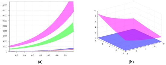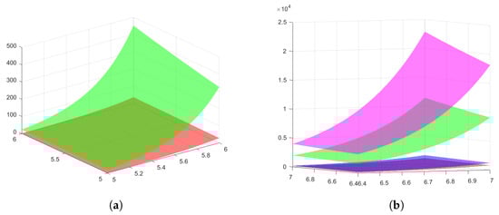 In Figure 2b, the graph surfaces of the left member (graph in blue) and the right member (graph in magenta) of the inequality from Theorem 5 are given for the particular case where , , and