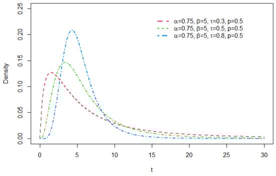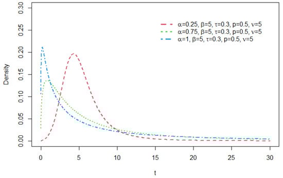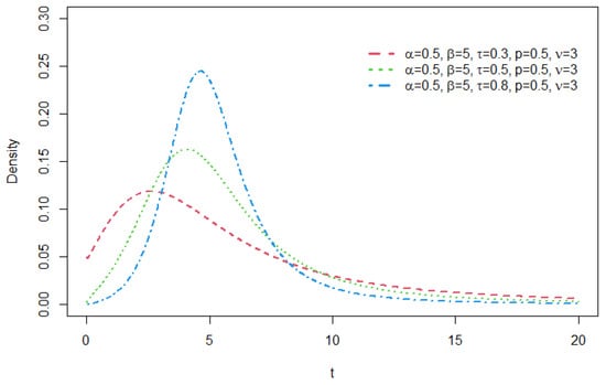 The Student’s t distribution belongs to the Maximum Domain of Attraction (MDA) of the Fréchet distribution with index ν, which means that the distribution of a properly normalized maximum of independent and identically distributed (i.i.d.) Student’s t random variables converge to a Fréchet distribution asymptotically. In [12], it is shown that the tail of the GCR2-t distribution is regularly varying with index τν, and thus, it also belongs to the MDA of the Fréchet distribution. Compared to the tail of the GCR-t distribution that has the index ν, the tail of GCR2-t becomes heavier than that of the GCR-t when τ becomes smaller than . Figure 1, Figure 2 and Figure 3 illustrate the shapes of the GCR2-t density function for a few sets of prescribed parameter values.