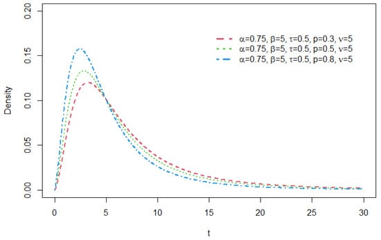Density functions of GCR2-t distribution with = 0.75, = 5, = 0.5, p and = 5.