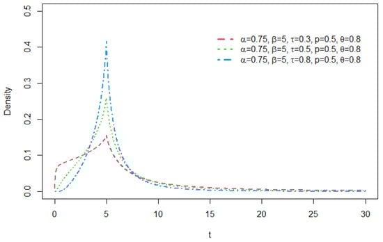 Density functions of GCR2-t distribution with , = 5, , p = 0.5, and = 5.