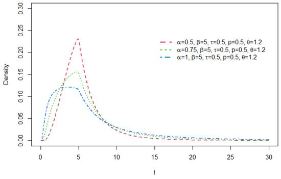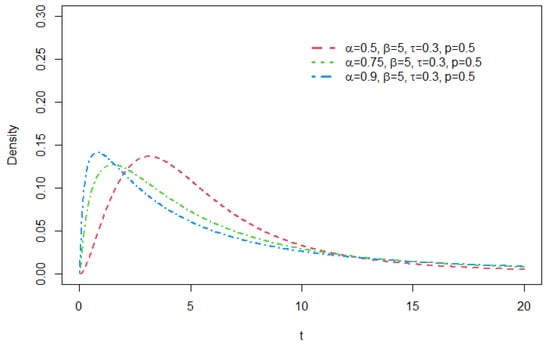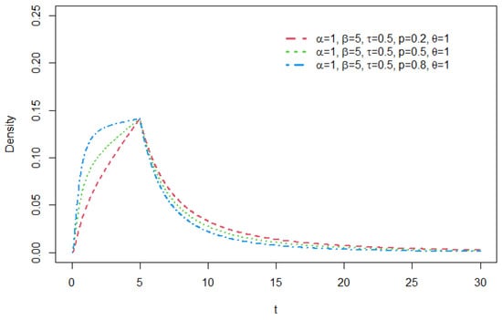 Density functions of GCR2-LG distribution with = 0.75, = 5, and p = 0.5.
