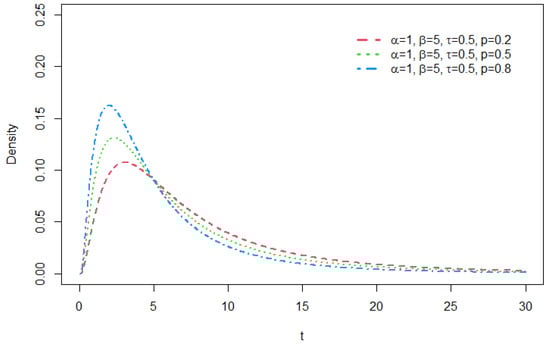 Density functions of GCR2-GG distribution with , = 5, , p = 0.5, and = 1.2.