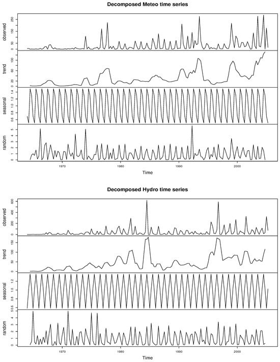 Table 1 presents summary statistics of losses due to meteorological and hydrological disasters in Asia. The descriptive statistics, along with the histogram and the normal Q-Q plots (Figure 10 and Figure 11), suggest that the marginal distributions of the two variables are both positively skewed and heavy-tailed. Many time series include some deterministic components such as long-term trends and seasonality. To isolate the deterministic components, each quarterly time series is decomposed under the multiplicative model assumption. The time series decompositions given in Figure 12 show the presence of strong seasonality in both time series and weak evidence of long-term trend. Since the proposed GCR2 models do not assume any deterministic seasonality, we deseasonalize each time series by dividing it by its estimated seasonal component.