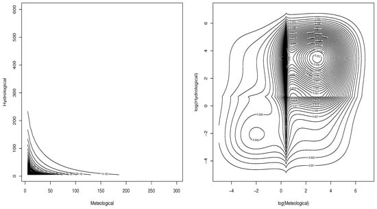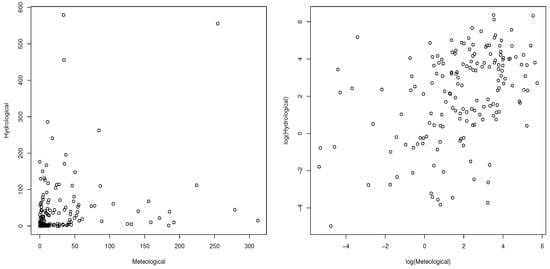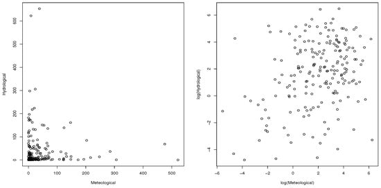 In [12], the usefulness of the univariate GCR2 models for heavy-tailed data modeling has been demonstrated through an application with a real loss dataset. In this section, we fit several bivariate Type-II generalized crack distributions on a real catastrophic loss dataset compiled from the International Disaster Database (EM-DAT, www.emdat.be, accessed on 22 November 2024). Specifically, each observation in the dataset is composed of two variables: ‘Meteo’ and ‘Hydro’. Marginally, ‘Meteo’ is a quarterly time series of (estimated) losses from meteorological disasters such as storms and extreme temperatures, spanning from 1950 to 2022 in Asia, and ‘Hydro’ is a series of (estimated) losses due to hydrological disasters such as flood and landslide for the same geographical area and the time span. For bivariate model fitting, we remove the pairs with missing observations, resulting in a bivariate dataset with 166 observations. The losses are inflation-adjusted to be equivalent to the US dollar values in 2021.