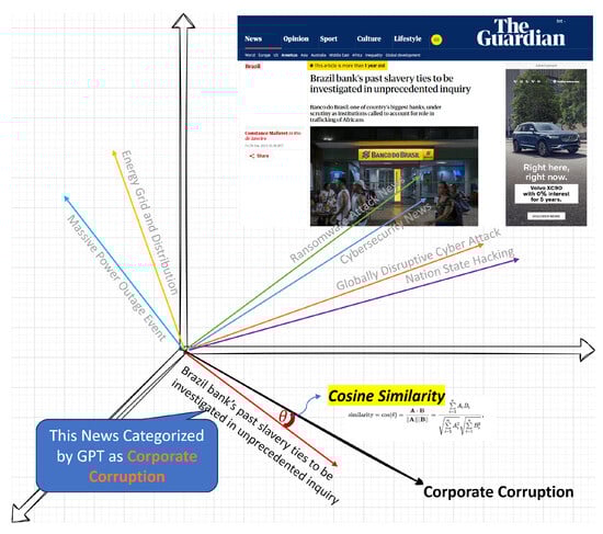 The proposed system leverages GPT models to extract structured features from unstructured news titles and descriptions []. These features include detailed classifications such as 202 news subcategories (mapped to 11 main categories), event date, location, impacted countries, and event significance. For instance, as shown in Figure 1, considering a news article titled “Brazil bank’s past slavery ties to be investigated in unprecedented inquiry”, this title can be compared against various category labels when processed through the GPT embedding model. The category “Corporate Corruption” yields the highest cosine similarity score with the title’s embedding vector, indicating strong alignment between the article’s content and this category. Consequently, the article is classified under “Corporate Corruption”. This method leverages GPT’s ability to capture semantic nuances in text, enabling accurate classification based on the contextual meaning of the content, as demonstrated in [,]. Furthermore, a significance score is computed based on these attributes, allowing the system to rank events by importance and relevance.