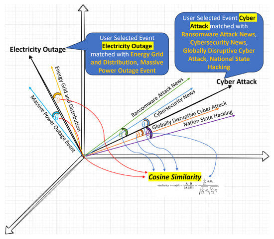 The system also includes a correlation analysis feature, which enables users to explore the relationship between two user-defined events over a specific date range []. GPT-based embeddings are used to match these events to relevant subcategories, as seen in Figure 2 []. As shown in Figure 2, the first user-selected event, “Cyber Attack”, is found to be similar to the subcategories “Ransomware Attack”, “Cybersecurity News”, “Globally Disruptive Cyber Attack”, and “Nation State Hacking” because of the higher cosine similarity in the vector space. On the other hand, for “Electricity Outage”, the subcategories “Energy Grid and Distribution” and “Massive Power Outage Event” are the best fits. After matching the subcategories with the user-selected events, all of the news pertaining to the matched subcategories is fetched, then frequency analysis is conducted to calculate correlation coefficients. This allows users to discern possible linkages between different events, enhancing their ability to make informed decisions.