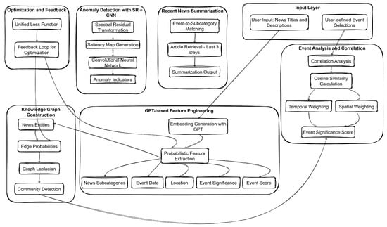Finally, the system is optimized through a unified loss function that integrates objectives for feature extraction accuracy, relationship modeling relevance, and anomaly detection performance. Gradient-based optimization techniques and regularization are applied to ensure the model’s robustness and generalizability across different datasets []. Figure 3 visually encapsulates the intricate mathematical interactions and contributions of the proposed news analytics system. This study introduces a groundbreaking integration of GPT-based feature engineering, probabilistic modeling, and eigenvalue decomposition within a unified framework, enabling large-scale semantic analysis and anomaly detection in news data surpassing traditional machine learning methods in terms of scalability, robustness, and contextual accuracy.