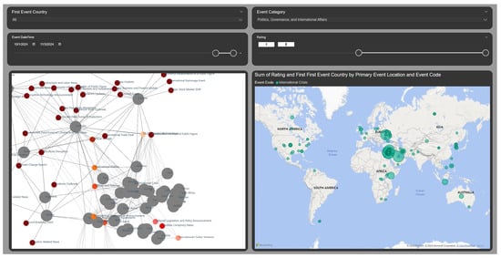 Figure 4 visualizes the knowledge graph generated from the news articles, showcasing the links between events and impacted countries. The graph structure illustrates the interconnectedness of different events across geographical locations, supporting in-depth geopolitical and thematic analysis. In constructing the adjacency matrix for the Laplacian graph, we mitigated the computational challenges associated with large-scale data by employing a multi-tiered approach. Filters for date, news category, significance, and country were used to regulate the data flow, ensuring manageable subsets for graph construction. For instance, the scenario depicted in Figure 4 was filtered using the following criteria: (1) event dates between 1 October 2024 and 3 November 2024, (2) event categories within “Politics, Governance, and International Affairs”, and (3) events with high significance (greater than 2). In cases of data overflow or noise, the geospatial map in Figure 4 exclusively provides decision-makers with the most relevant information. Furthermore, GPT-based classification and categorization reduced the dimensionality and noise in the raw news data. As shown in Figure 4, this preprocessing step helps to optimized the graph’s input data, resulting in a more efficient and meaningful knowledge graph. These strategies address typical limitations of Laplacian graphs such as performance drops with noisy data and computational demands for large graphs.