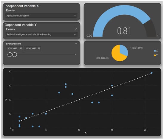Figure 6 shows the correlation analysis between two news subcategories, revealing potential relationships between events. The visual representations with the correlation coefficient, data distributions, and selection of dates and events provide insights into the frequency and intensity of these relationships, assisting in identifying emerging patterns across news topics.