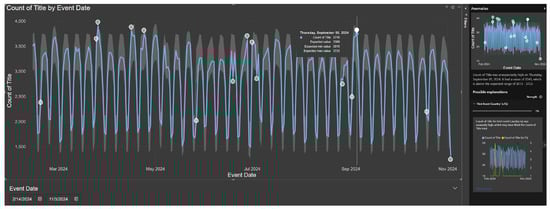 Figure 7 illustrates the anomaly detection results, with 85% sensitivity achieved through the CNN and SR techniques. Peaks in the time series represent detected anomalies, highlighting unexpected spikes or drops in news frequency. This feature helps users to monitor unusual trends, providing an early indication of significant developments in the news cycle.