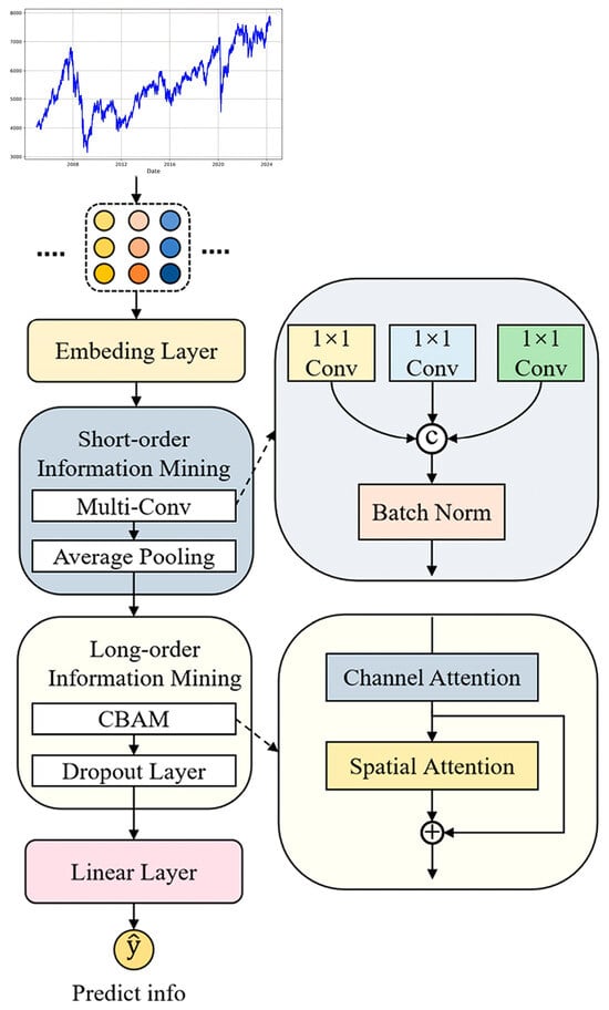 The stock market operates within a dynamic and intricate economic system [3]. Stock prices are influenced by a multitude of factors, including a company’s financial metrics, industry outlook, management practices, governance, and broader macroeconomic climate. Additionally, irrational elements such as market sentiment contribute to complexity, rendering stock prices highly nonlinear and stochastic and challenging to predict [4]. Early approaches predominantly relied on statistical and econometric methods such as moving averages and regression analysis. While these methods capture market trends to some extent, their capacity to handle nonlinear data is limited. With the advancement of machine-learning technology, data-driven approaches have emerged as effective tools for prediction across various domains [5]. Machine-learning algorithms such as support vector machines, random forests, and neural networks are used to construct prediction models. These algorithms can handle complex nonlinear relationships, but they usually require considerable feature engineering and are very sensitive to the selection of model parameters [6]. In recent years, deep-learning techniques have exhibited substantial promise across diverse domains, notably in areas such as image recognition [7], natural language processing [8], and reinforcement learning [9]. In financial technology, deep-learning models, particularly hybrid models that combine LSTM and CNN, have proven effective for capturing both long- and short-term dependencies within time-series data. The inclusion of attention mechanisms, such as the convolutional block attention module (CBAM), further enhances these models by facilitating adaptive feature refinement, a key advantage in the highly variable environment of financial forecasting [10,11]. As a result, deep-learning-based hybrid models incorporating attention mechanisms have gained significant research interest, offering a robust approach to managing the complexities inherent in stock market data.