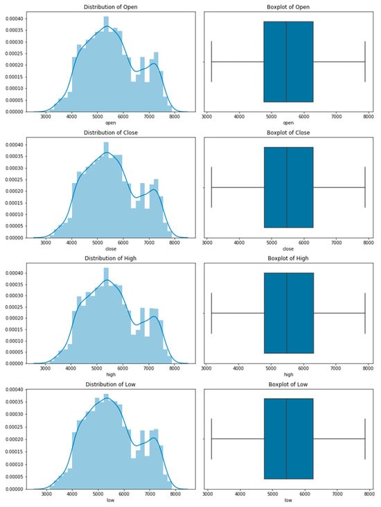 To comprehensively examine the distribution characteristics of the dataset, histograms and boxplots were generated for each feature (e.g., open, close, high, and low), as shown in Figure 2. The histograms illustrate the overall distribution and potential skewness of each variable, while the boxplots highlight any outliers. This analysis provides insight into inherent biases or skewness within the dataset, ensuring that the features are accurately represented for predictive modeling purposes.