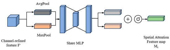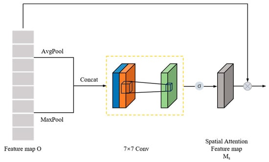 The second component of CBAM, which is designed to examine internal relationships within the spatial dimensions of feature information, is the spatial attention module, which enhances the interactive perception ability of the model toward input features. Its architecture, depicted in Figure 4, begins with average pooling and max pooling operations, followed by concatenation of the pooled results. A standard 7 × 7 convolutional layer and sigmoid activation function are subsequently applied to generate the spatial attention feature map. This process can be outlined as follows: