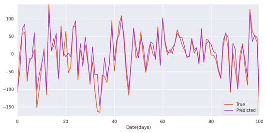 The results show that the daily changes in opening price significantly outperform other price change indicators in terms of prediction accuracy. To illustrate the model’s performance, fit plots were generated to compare the actual and predicted values (Figure 5). These plots clearly highlight the predictive capability of the opening price changes over different periods. Furthermore, a detailed analysis of a subset of 100 days from the 600-day sample (Figure 6) further confirmed the stability and reliability of the predictions.