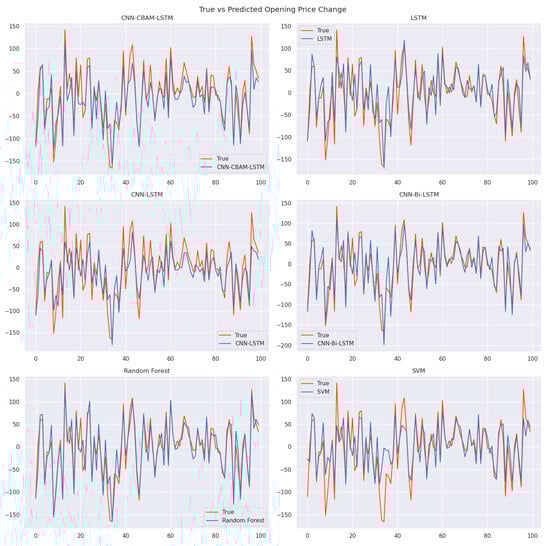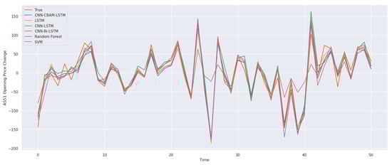 To better show the model’s efficacy, this study compares it with the LSTM, CNN-LSTM, CNN-BiLSTM, random walk, random forest, and SVM models trained on identical datasets. The inputs consist of the opening price, highest price, lowest price, closing price, and trading volume, aimed at predicting the cumulative rate of return. Solely relying on historical single-stock indicators for future predictions may limit the model’s ability to capture comprehensive market trends. The incorporation of multidimensional data inputs enhances the model’s information retrieval capabilities.