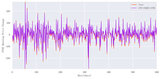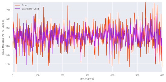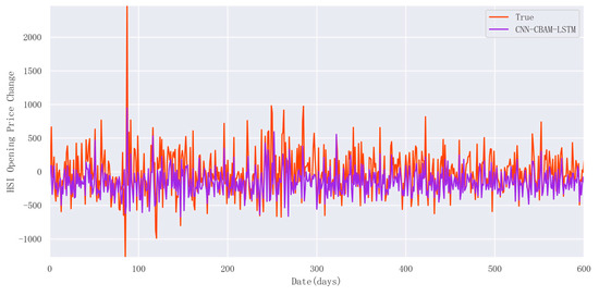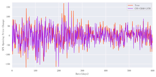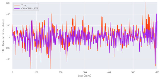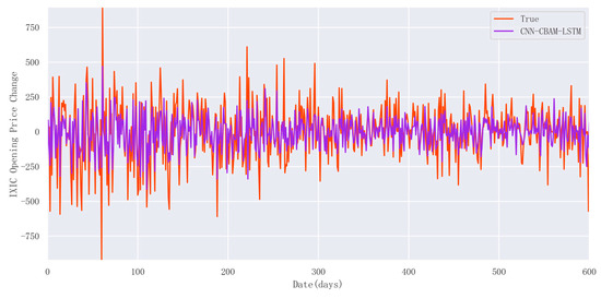 The partially enlarged subgraph in Figure 8 shows that the CNN-CBAM-LSTM prediction is very close to the true value curve. Even when the opening price fluctuates too much (absolute value greater than 50), it is difficult for the model to fit to the peak, but the general direction of the rise and fall is correct, which proves that the model successfully captures the changes in the opening price.