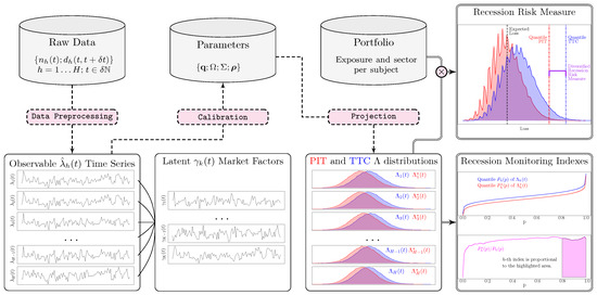 The RecessionRisk+ model consists of the two multivariate hazard rate distributions introduced to represent and compare the PIT and the TTC one-year tail default risk over a given set of clusters (e.g., sectors). The comparison between these two distributions enables us to monitor and quantify a counter-cyclical Recession Risk component separately from the “standard” default risk measure, as shown in Section 2.5 and Section 2.6. Figure 1 displays a diagram summarizing the steps involved in the model calibration and application, as described in the remainder of this section.
