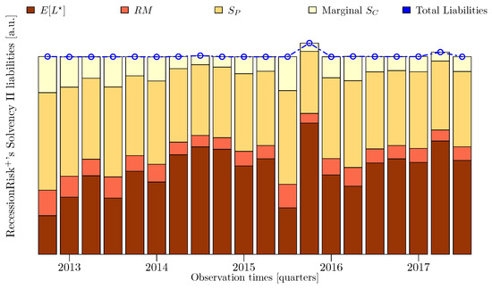 Recessions are characterized by a general increase in the likelihood of defaults (see, e.g., refs. [7,8] and the definition of Moody’s scenario “S3” in [9]). Thus, the frequency of default and insolvency events observed during a recession is significantly higher than average. In this work, “Recession Risk” refers to the potential unexpected losses experienced by an insurance company, a bank, or other financial institution in such an adverse scenario, due to the increased number of insolvent counterparties.