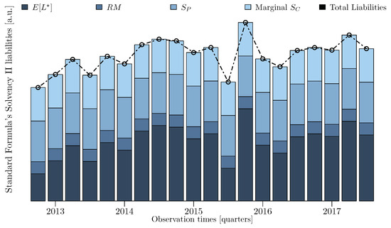 Solvency II liabilities applying the Solvency II Standard Formula (quarterly simulations). The liabilities’ level is displayed on a logarithmic scale and with arbitrary units of economic value.