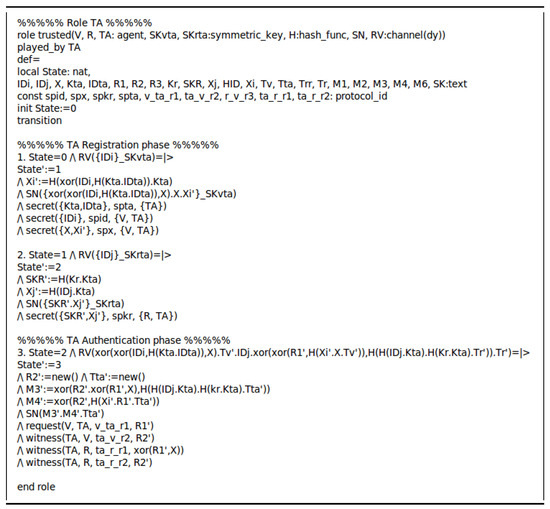 can intercept exchanged messages via an open channel. The next goal is to modify the login request message . Although obtains from the message, still needs to compute , which is used to calculate and . The TA can easily detect a tampered because is derived from the parameter related to , which is stored in the secure database of TA. In addition, modifying all messages is impossible because they include random parameters that change with each session. Similarly, it is difficult to modify the message sent from the to the TA, as the parameters are masked with the shared secret key between and the TA. Accordingly, these messages are unavailable to , preventing the implementation of MitM attacks. Therefore, the proposed scheme is resistant to MitM attacks.