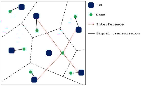 In these studies, the Poisson Point Process (PPP) is often employed to model inter-cell interference from different base stations (BSs) in dense cellular networks. Additionally, several works have extended PPP-based models to examine the impact of limited channel state information at the transmitter (CSIT) on multi-antenna transmission, especially when downlink transmission is affected by multicell interference. For example, Ref. [8] modeled a dense cellular network using a homogeneous PPP, where each user’s received signal was heavily interfered with by signals from multiple BSs. Each user provided partial CSIT through limited feedback, and BSs performed multi-antenna transmission based on this partial information. The study analyzed the optimal feedback rate to maximize net spectral efficiency, utilizing maximum ratio transmission (MRT) and zero-forcing beamforming (ZFBF) for single-user and multi-user cases, respectively. This research has been extended to various applications. For instance, Ref. [9] explored the net secrecy rate rather than net spectral efficiency, and Refs. [10,11] examined scenarios where the number of receiving antennas is greater than one, analyzing the effect of this on system performance. Specifically, Ref. [10] focused on the single-user case, while Ref. [11] addressed the multi-user scenario.