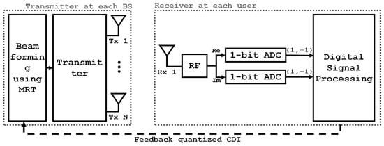 Figure 2 presents a block diagram of the downlink transmission. The target user quantizes their channel direction vector and feeds back the quantized channel direction information (CDI) to the BS for beamforming. The BS associated with the target user employs MRT as a beamforming strategy using N transmit antennas. The real and imaginary components of the signal received by the target user are processed through individual one-bit ADCs prior to digital signal processing.