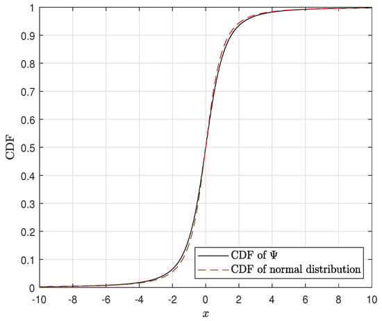 - For each realization of the channel distributions ( and ), both the conditional CDF of and the CDF of a normal distribution with a variance equal to V are obtained