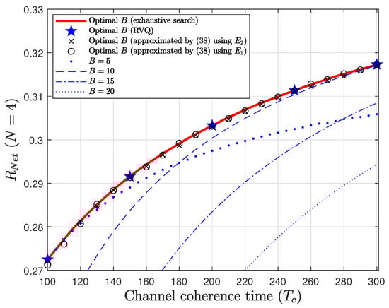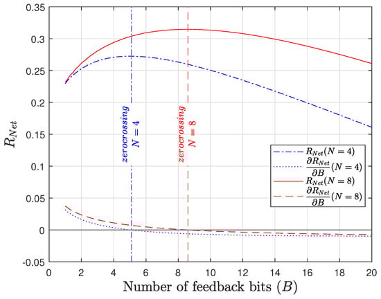 In this subsection, we analyze the optimal number of feedback bits for maximizing the net spectral efficiency . Since is a real-valued function of B, its optimal value can be found by identifying its critical points. Although the number of feedback bits B must be a natural number in practical systems, the QUB model introduced in Section 2.2 allows us to assume that B is a real number. Simulations show that there exists a unique critical point corresponding to the maximum. For simplicity, we introduce the following notation: