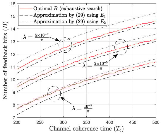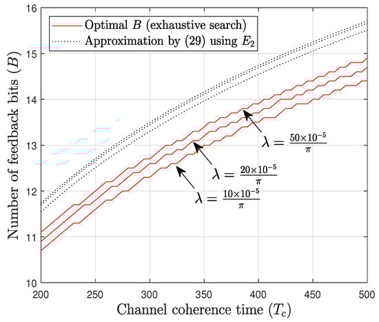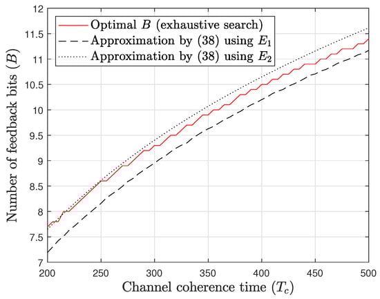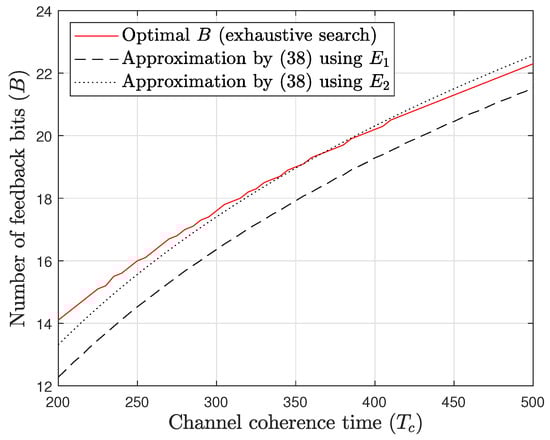 for , where is used for the calculation. This result approximates the scaling rate of the optimal number of feedback bits as a function of the channel coherence time .