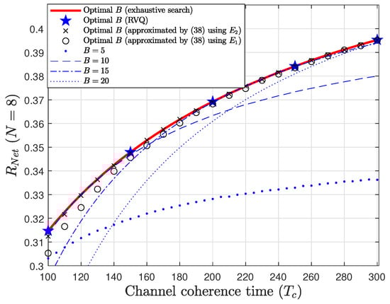 In Figure 4, the net spectral efficiency , defined in (21), is plotted as a function of B, demonstrating that there is typically, at most, one maximum point. This is because the ergodic spectral efficiency is described by a concave function (since is convex [13]) whose derivative is positive and converges to zero, while has a constant slope. Thus, if a critical point exists, there is at most one corresponding to the global maximum. If no critical point exists, the net spectral efficiency is maximized when . Figure 4 also shows that this critical point can be identified by finding the zero-crossing of the derivative of , which is obtained in the figure by solving (26).