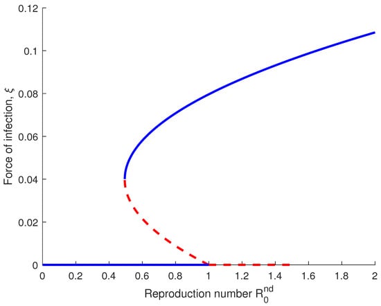 Note that items (1)–(5) in Theorem 5 suggest the possibility of backward bifurcation at The backward bifurcation is a phenomenon that occurs in several disease models. This is when a stable tuberculosis-free equilibrium (TBFE) point exists together with a stable endemic equilibrium point even when . The epidemiological explanation of this phenomenon is that while is necessary for disease elimination, it is not sufficient for the effective control of the tuberculosis disease. Hence, there must be a new critical threshold to wipe out the disease [43,44,45].