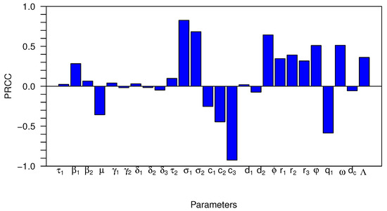 PRCC values for the parameters of the TB-DM Model (1) using the as response function. the top influential model parameters are highlighted in bold font.